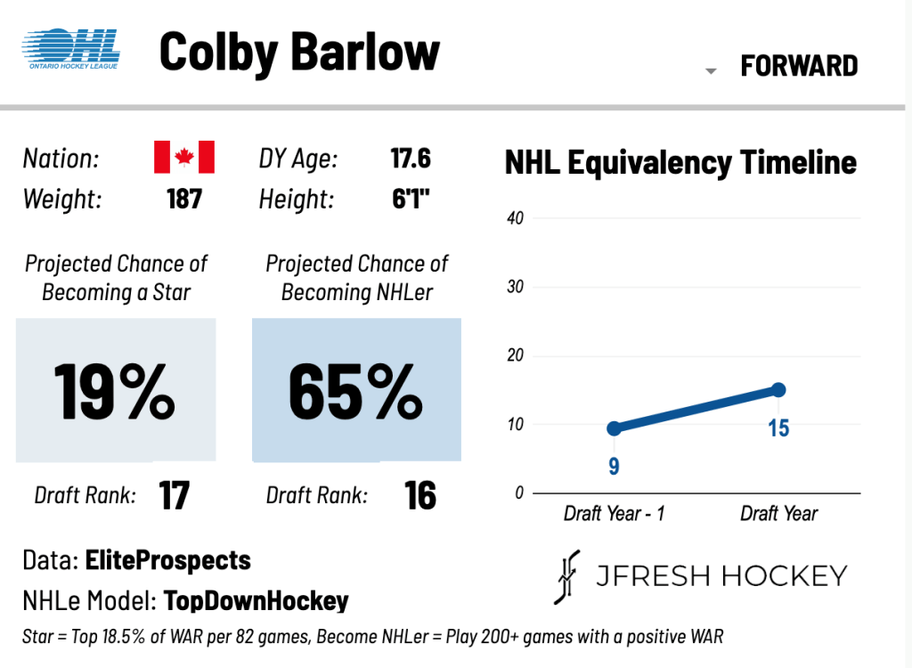 Colby Barlow to the Winnipeg Jets just feels right. Scott Wheeler of The Athletic describes him as so: “He has a high floor and should safely become a strong third-line player but also has the upside to become more if things really click in his north-south game at the next level.”
