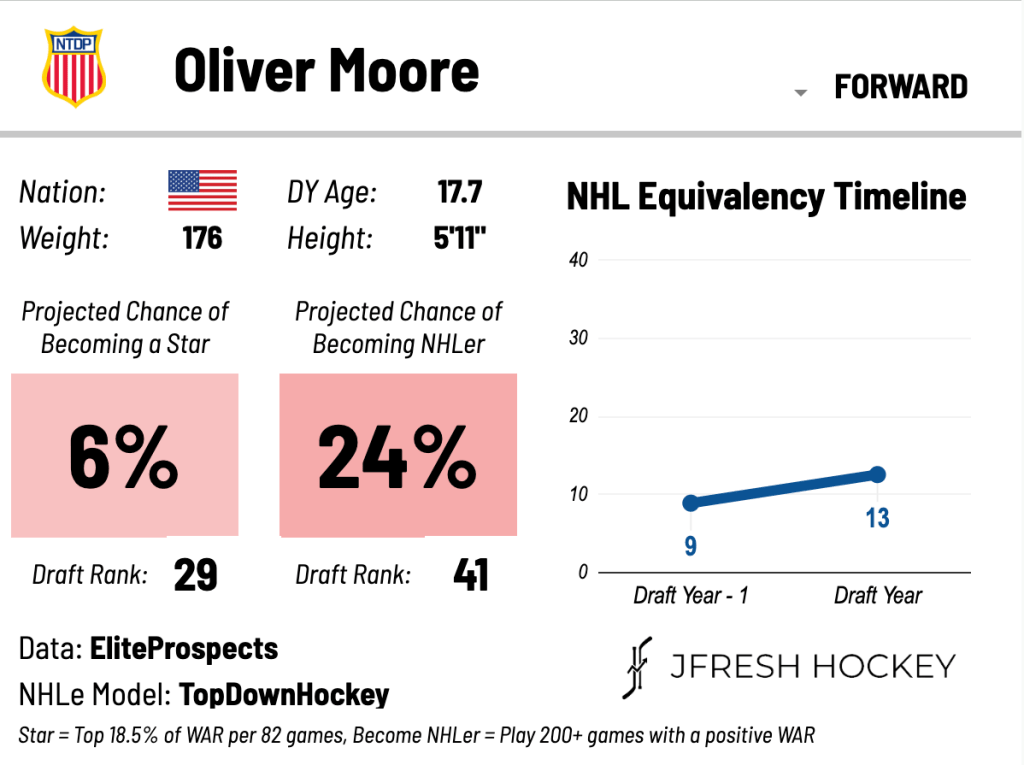 The ever-so-popular mock for the Winnipeg Jets at 18, Oliver Moore. Corey Pronman of The Athletic and Craig Button of TSN share this same thought, and even though his production wasn’t at the level you would’ve hoped, I love this outcome for the Jets.